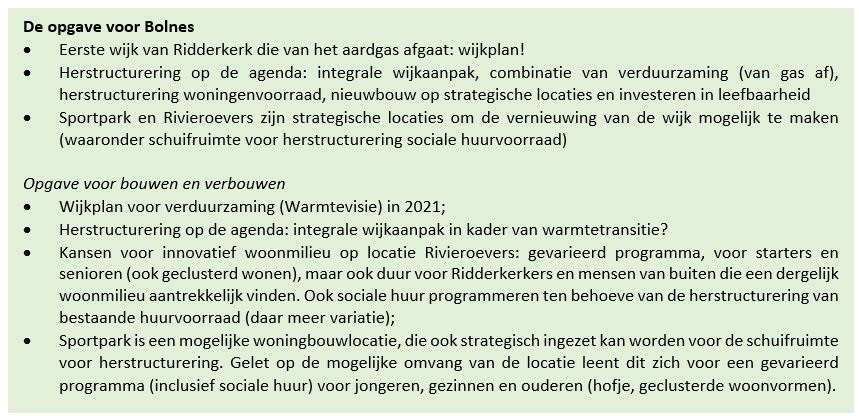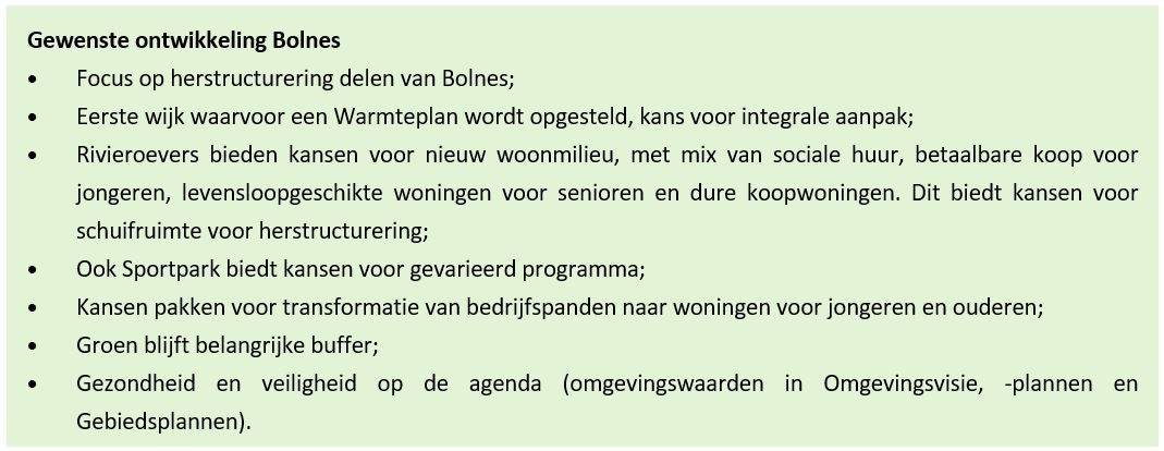 Bolnes is de eerste wijk waarvoor een warmteplan wordt opgesteld (2021).Daarvoor zal een eerste wijkplan gemaakt worden. Dit biedt kansen voor een integrale aanpak van de wijk. Immers, de opgave is ook om de verouderde woningvoorraad te vernieuwen en een grotere differentiatie te creëren. De concentratie van sociale woningbouw zou wat meer verspreid kunnen worden. Woningbouw aan de Rivieroevers en op de locatie van het sportpark biedt kansen om schuifruimte te creëren voor de herstructureringsopgave in Bolnes. Daar zullen dus ook nieuwe, toekomstbestendige sociale huurwoningen voor kleine huishoudens toegevoegd moeten worden (jongeren en ouderen). Dat biedt ruimte om elders in Bolnes meer variatie in de woningvoorraad te maken. Locatie Rivieroevers biedt kansen voor een geheel nieuw soort woonmilieu, met behoud van het industriële karakter. Dan is wel een goede mix nodig: van sociale huur, goedkoop/betaalbare koop voor jongeren, levensloopgeschikte woningen voor senioren én dure koopwoningen.
