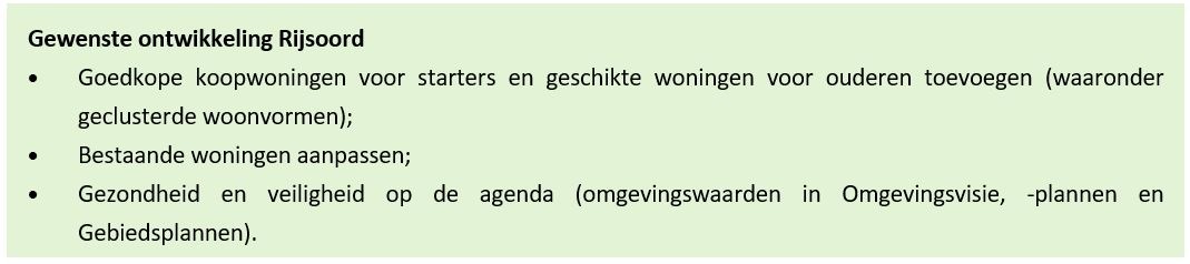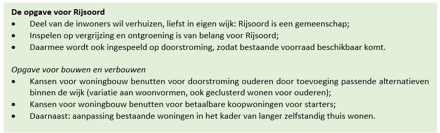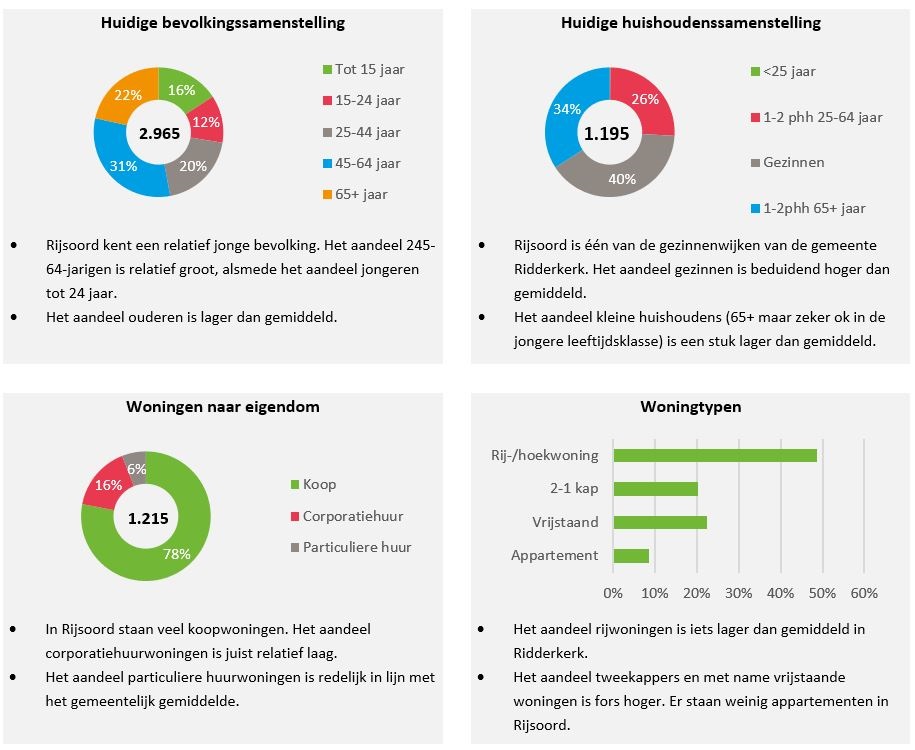 De grootste toevoeging van woningen in Rijsoord hebben plaatsgevonden in de jaren ’60 en ’70 van de vorige eeuw. Het overgrote deel van de wijk bestaat uit eengezinswoningen in de koopsector. Rijsoord is een zeer sociaal en betrokken buurtschap (‘ons kent ons’-cultuur), met een rijk verenigingsleven, verbindingen met de basisscholen, ondernemers en de kerken. De meeste inwoners van Rijsoord zijn tevreden over huidige woonsituatie. Een deel wil echter verhuizen, liefst in eigen wijk. Ook in Rijsoord veranderen de tijden: lidmaatschap van verenigingen loopt terug, er is instroom van nieuwe inwoners. Er wonen veel gezinnen in de wijk. Maar ook Rijsoord vergrijst en ontgroent, net als veel andere wijken in Ridderkerk.