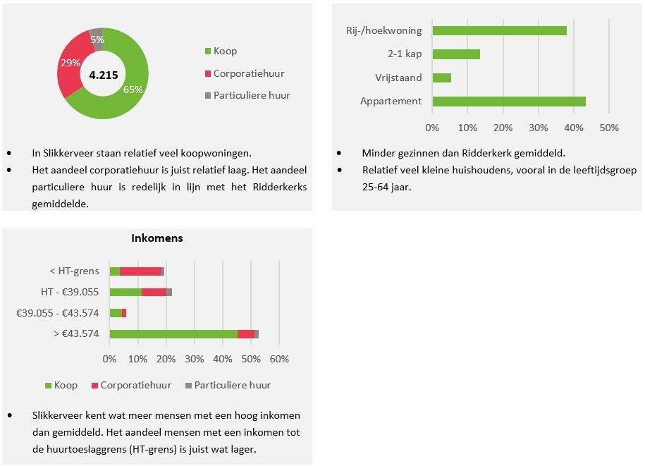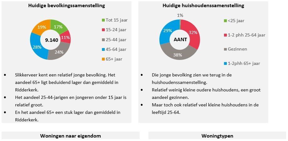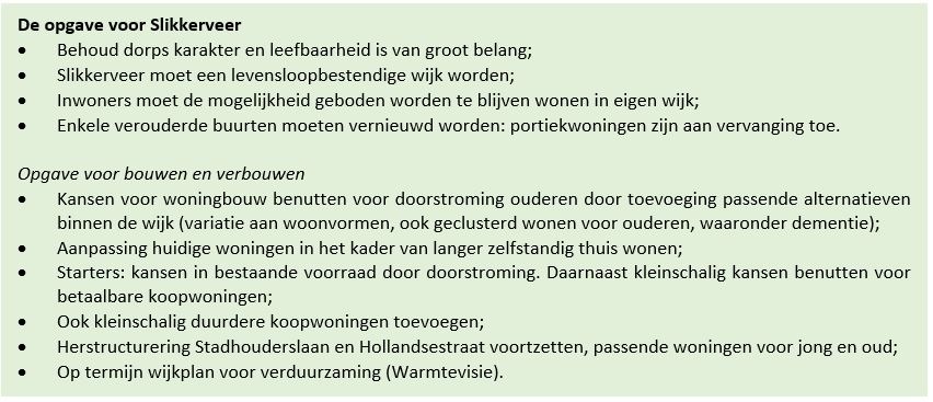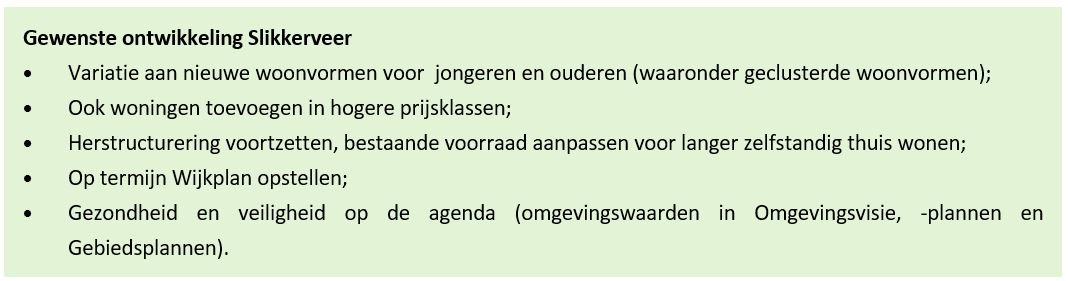 Slikkerveer is een wijk met veel voorzieningen. De woningvoorraad is divers, en heeft een redelijk goede kwaliteit. In Slikkerveer is sprake van saamhorigheid en gezelligheid. Het behoud van het dorpse karakter en leefbaarheid is van groot belang voor de inwoners. Senioren moet de mogelijkheid geboden worden in Slikkerveer te blijven wonen. Er zijn relatief veel appartementen, maar het is de vraag of ouderen hier willen wonen. Grondgebonden seniorenwoningen zijn wellicht een alternatief. Wel is het waarschijnlijk onvermijdelijk om compacter te bouwen, omdat ook het behoud van groen belangrijk is.
