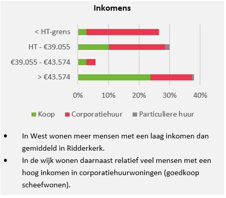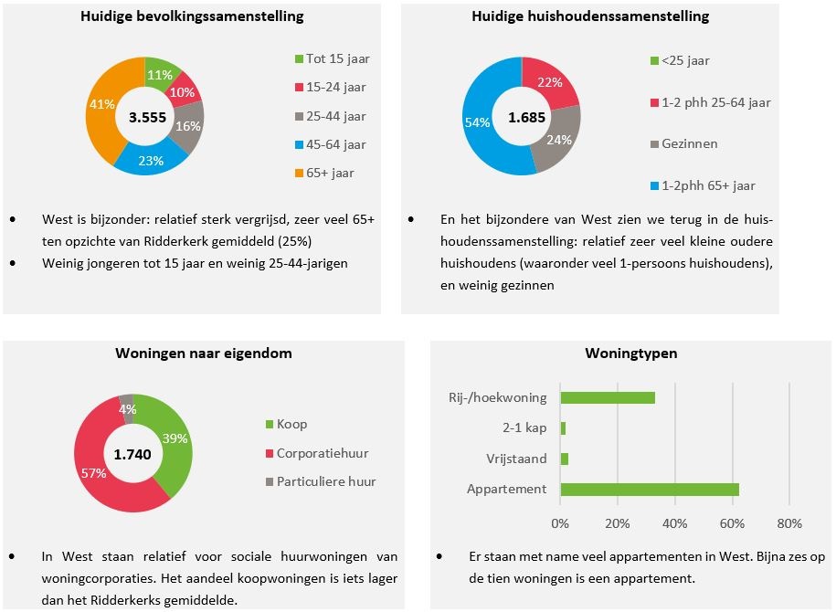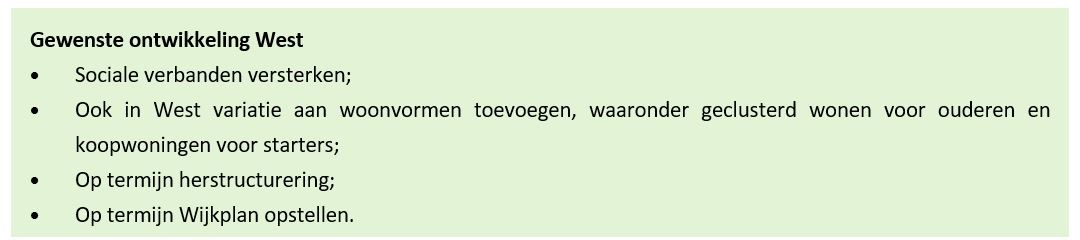 Wooncompas heeft relatief veel bezit. Herstructurering in West is nog niet aan de orde, maar mogelijk gaat dit in de toekomst wel spelen. Er is een aantal grote flats in West, waar veel senioren wonen. Her-structurering zou zich wel kunnen richten op wat meer grondgebonden woningen zodat er meer variatie is voor ouderen. Riederborgh levert ook zorg aan woningen in de buurt. Er liggen wellicht kansen voor een variatie aan voor ouderen geschikte woningen, zodat de functie van de Riederborgh wordt versterkt.