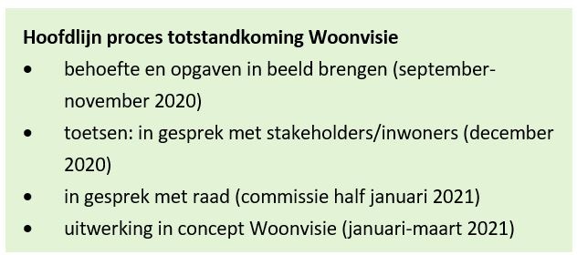 Daarnaast is met woningcorporatie Wooncompas afgestemd. Binnen de gemeente is gewerkt met een projectteam, bestaande uit adviseurs vanuit relevante beleidsvelden. Ook hebben we tussentijdens een discussiebijeenkomst gehad met de commissie Samen Wonen. De concept-Woonvisie heeft ook ter inzage gelegen voor inspraak. Deze Woonvisie is het resultaat van de inbreng die we tijdens al deze sessies en de terinzagelegging hebben opgehaald.