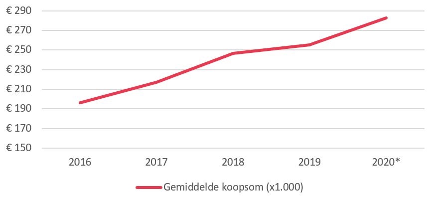 De verkoopwaarde steeg overigens snel in de afgelopen jaren: in 2016 was de gemiddelde verkoopprijs in Ridderkerk nog zo’n € 200.000, in 2020 dus € 283.000. Dit is een jaarlijkse stijging van zo’n 10%. Dat is in lijn met de gemiddelde stijging in de Stadsregio Rotterdam. Ridderkerk onderdeel uitmaakt van de suburbane regio waar veel druk op de woningmarkt staat.
