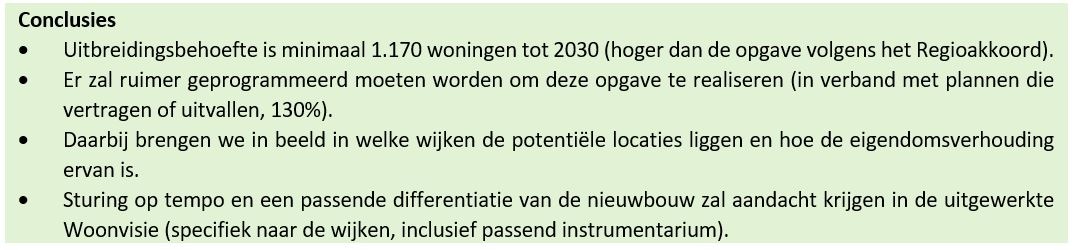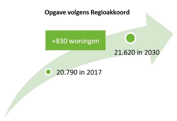 In 2030 zou de behoefte volgens deze prognose rond 2030-2035 circa 22.200 huishoudens zijn. De woningvoorraad was op 1 januari 2021 circa 21.310. Dit betekent in ieder geval een opgave van afgerond 900 woningen voor de periode 2021 tot 2030. Het gaat hierbij om uitbreiding van de woningvoorraad: sloop moet getalsmatig gecompenseerd worden om voldoende woningen te houden. Voor een duiding van deze cijfers in verhouding tot het Regioakkoord verwijzen we naar bijlage 1.