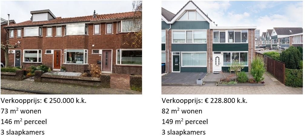 Er is een grote vraag naar goedkopere grondgebonden woningen (onder de € 250.000). Dit vraagt enige duiding. Het is de vraag in hoeverre deze vraag realistisch is (en blijft) in een woningmarkt met stijgende verkoopprijzen. In 2020 kostte de gemiddelde rij-/ hoekwoning in Ridderkerk zo’n € 292.000. Tweekappers gingen voor gemiddeld € 415.000 naar een nieuwe eigenaar. Onderstaande afbeeldingen geven een indicatie van bestaand aanbod aan grondgebonden woningen onder de € 250.000.