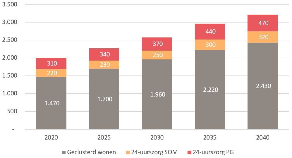 Er is een groeiende behoefte aan verschillende vormen van geclusterd wonen (extramuraal, denk aan seniorenwoning in complex, serviceflat, hofjeswonen zoals bijvoorbeeld Knarrenhof, aanleunwo-ning). En er is een groeiende behoefte aan intramurale woonvormen met 24-uurs zorg voor SOM (intramuraal wonen in een verpleeghuis op plekken waar somatische zorg gegeven kan worden) en PG intramuraal wonen in verpleeghuis, kleinschalig wonen dementie, waar psychogeriatrische zorg gegeven kan worden).