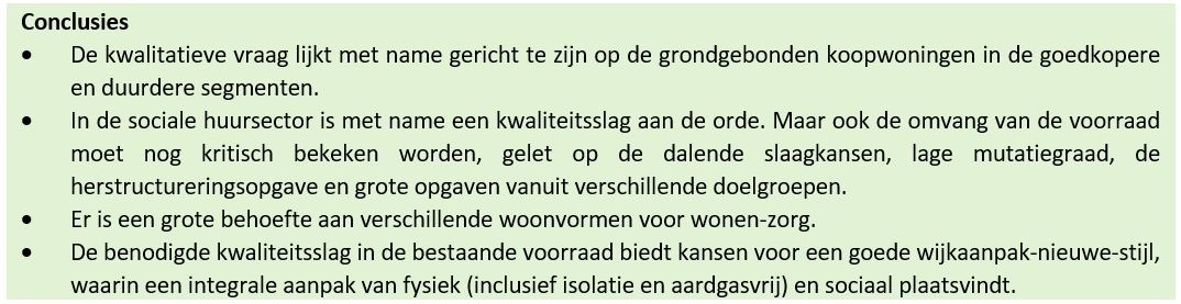 Zoals uit de diverse Wijkontwikkelingsprogramma’s blijkt, is een kwaliteitsslag in de bestaande woning-voorraad nodig. Door herstructurering en transformatie kan de kwaliteit van woningvoorraad en woon-omgeving in een aantal wijken sterk verbeteren (zie hoofdstuk 3, dat wordt in de loop van het proces aangevuld en aangescherpt).