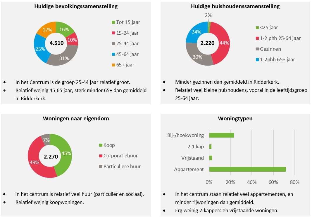 Het centrum is de wijk waarin de meeste voorzieningen van Ridderkerk liggen. Het kent vooral compacte bebouwing in de vorm van winkels en appartementen. Het wijkontwikkelingsprogramma constateert dat de kwaliteit van de woningvoorraad aandacht vraagt. Veel woningen voldoen niet meer aan de eisen van vandaag en morgen.