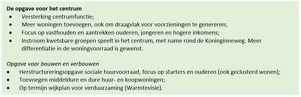 Er zijn enkele verouderde buurten die aandacht vragen. Met name portiekwoningen zonder lift zijn aan vervanging toe. Voor de komende jaren staat de sloop van een aantal sociale huurwoningen gepland. Daar worden nieuwe sociale huurwoningen voor teruggebouwd.