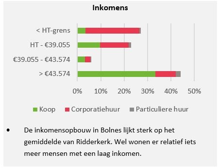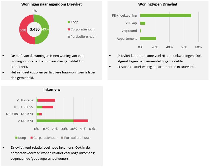 In vergelijking met andere gemeenten in de regio bestaat de woningvoorraad van Ridderkerk uit veel sociale huurwoningen. Ook staan er relatief veel appartementen en rijwoningen. De voorraad huurwoningen van corporaties bedraagt circa 40% (ca 8.000 woningen, sociale huur en vrijesector huur). Daarnaast is er nog een relatief klein aanbod van circa 800 woningen in handen van overige (particuliere) verhuurders. In West, Oost, Bolnes en Centrum bestaat ongeveer de helft van de woningen uit corporatiewoningen (met name sociale huur). In de overige wijken is dat beduidend lager. De voorraad sociale huurwoningen staat er voor een groot deel prima voor. Wel is er een opgave voor verduurzaming. Daarnaast zal een aantal complexen aangepakt moeten worden. De kwaliteit past onvoldoende bij de woonwensen die we voor de toekomst verwachten (kleiner, duurzaam, levensloopbestendig). Het is van belang om samen met de corporaties te bepalen welke opgave we gezamenlijk oppakken en wat daar voor nodig is.