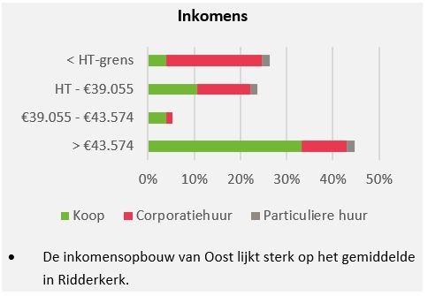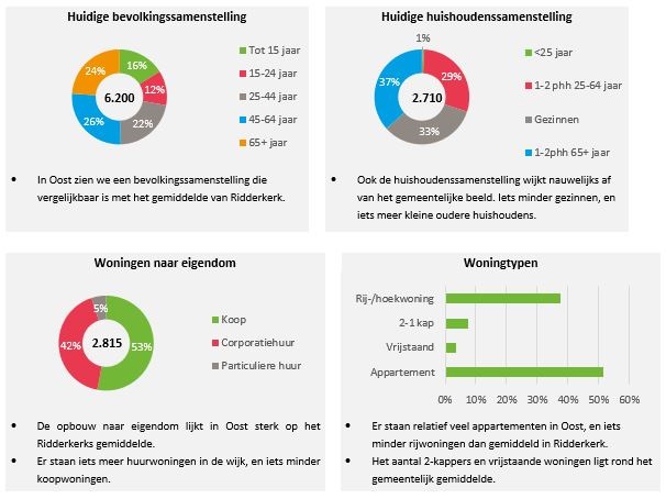 Oost kent een redelijk gelijke verdeling tussen kleine huishoudens en gezinnen. Daarnaast is sprake van een behoorlijke variatie in woningtypen. De buurten binnen Oost hebben eigen karakter, met per buurt vooral gelijksoortige woningen: