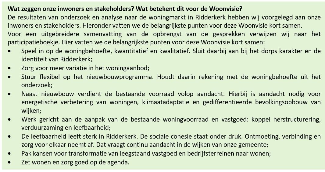 Een Woonvisie is geen plan op zich: het dient doelen die we elders al voor Ridderkerk hebben beschreven en die ook gevolgen hebben voor het wonen. Zoals bijvoorbeeld in de Omgevingsvisie, het Coalitieakkoord en het Collegeprogramma, de Beleidsnota Integraal Beleid Sociaal Domein en de Warmtevisie. In dit hoofdstuk beschrijven we een aantal uitgangspunten die uit die plannen en programma’s opgemaakt kunnen worden. Daarnaast geven we beknopt aan wat onderzoek en analyses van de woningmarkt hebben opgeleverd. Ook de gesprekken met inwoners en stakeholders zijn zeer waardevol geweest. Wat betekent dit voor de visie op het wonen? En welke thema’s en ambities zouden dan voor deze Woonvisie centraal moeten staan?