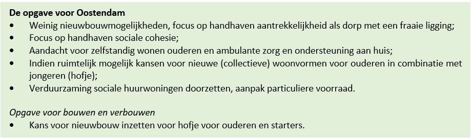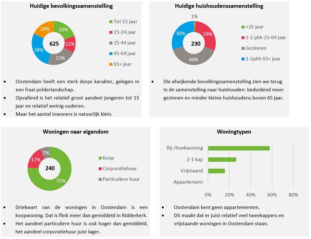 Ruimtegebrek speelt een grote rol. Oostendam zit klem tussen de Waal en de A15. De bewoners vinden dat de wijk is volgebouwd. Maar wellicht zijn er kansen om grote percelen te splitsen. Ook in Oostendam is aandacht nodig voor de afname van de sociale cohesie. Het is wenselijk om senioren zo lang mogelijk in hun netwerk van de wijk te laten wonen (door ambulante ondersteuning indien dat nodig is). Voor jongeren zouden goedkope koopwoningen passend zijn. Afhankelijk van de ruimtelijke mogelijkheden kan aan een kleinschalige combinatie van jongeren en ouderen gedacht worden, wellicht in de vorm van een hofje. De huurwoningen van Wooncompas worden aangepakt: bestaande woningen worden verbouwd tot nul-op-de-meter-woningen.
