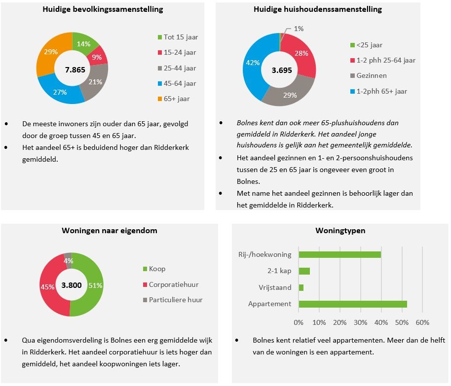 Binnen Bolnes zijn de verschillen groot: er zijn flats uit jaren ’60 en ’70, dure koopwoningen uit de jaren ’90, kleine corporatiewoningen uit het begin van de 20e eeuw. En er is oude industrie langs de rivier. Bolnes heeft een relatief oude woningvoorraad. De kleine woningen in de wijk zijn populair, maar deze zouden wel opgeknapt moeten worden.