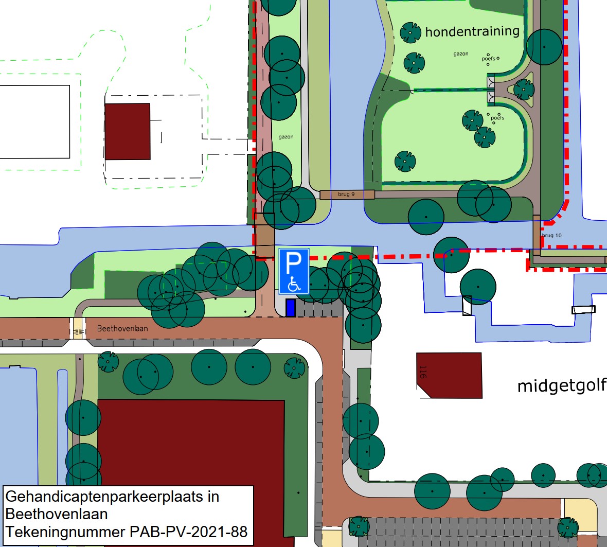 In de nieuwe situatie komt de huidige toegang naar het veld te vervallen en wordt er in plaats daarvan een nieuwe toegang vlakbij de Beethovenlaan gemaakt. Er ligt in deze laan een parkeerhaven die zich op een voor houders van een gehandicaptenparkeerkaart aanvaardbare loopafstand van de nieuwe toegang bevindt, zodat daar wel een gehandicaptenparkeerplaats kan worden aangewezen en ingericht. Het is wenselijk om de parkeerplaats in deze parkeerhaven die het dichtst bij de toegang naar het hondentrainingsveld ligt aan te wijzen als gehandicaptenparkeerplaats. De tekening PAB-PV-2021-88 geeft de nieuwe situatie na herinrichting weer met de locatie van de aan te wijzen gehandicaptenparkeerplaats.