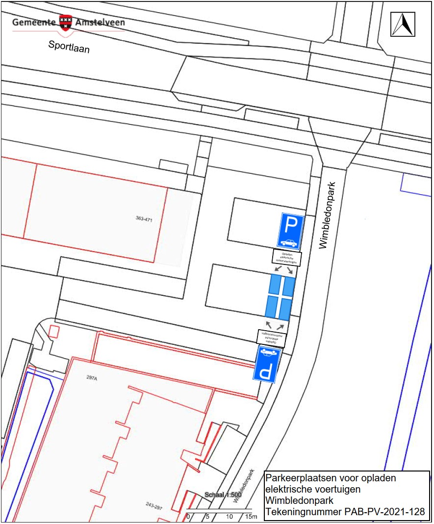Burgemeester en wethouders van Amstelveen besluiten om in de straat Wimbledonpark vier parkeerplaatsen aan te wijzen als parkeerplaats voor het opladen van elektrische motorvoertuigen. De parkeerplaatsen mogen alleen gebruikt worden voor het opladen van deze elektrische motorvoertuigen.