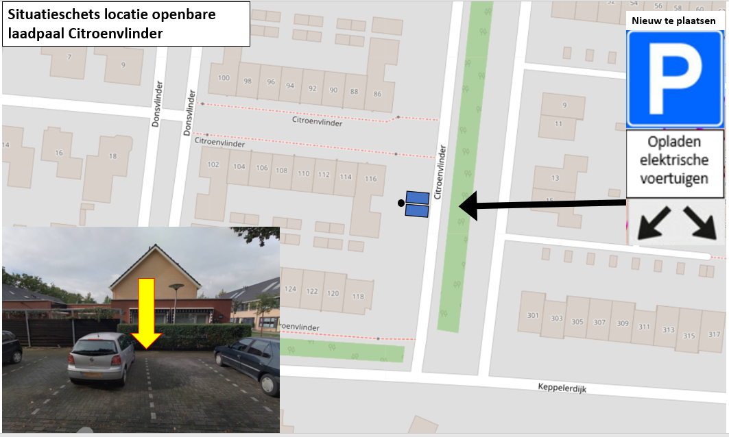 door middel van het plaatsen van het verkeersbord E4 van bijlage 1 van het RVV 1990 met een onderbord met de tekst ‘opladen elektrische voertuigen’ – en een onderbord met pijlen, waaruit blijkt dat het bord voor twee parkeerplaatsen van toepassing is – op de Citroenvlinder, een tweetal parkeerplaatsen te reserveren ten behoeve van het opladen van elektrische voertuigen.