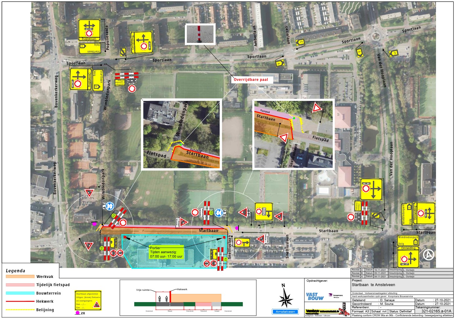 De oversteken van het tijdelijke fiets/bromfietspad naar het fietspad langs de Startbaan oostelijk van de bouwplaats en naar het fiets/bromfietspad tussen het Wimbledonpark en de Bovenkerkerweg worden met belijning op het wegdek gemarkeerd. Bouwverkeer dat de bouwplaats verlaat verleent bij de oversteek aan de oostkant van de bouwplaats voorrang aan fietsers, bromfietsers en voetgangers. Dit wordt met haaientanden en voorrangsborden aangegeven.