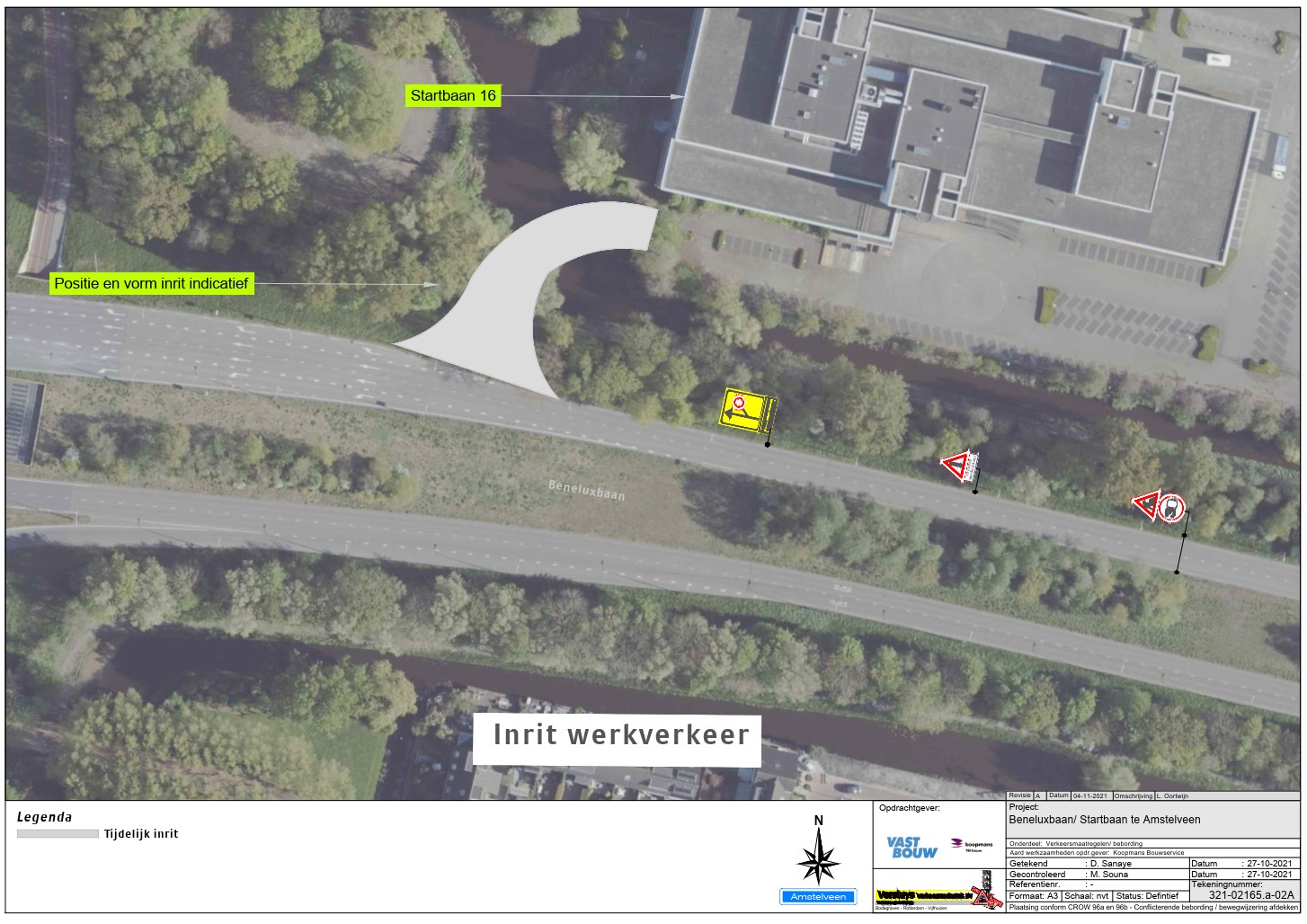 Er worden borden A1 met opschrift 30, B6, C1, C14, C16, G11 en G12a van bijlage 1 van het Reglement verkeersregels en verkeerstekens 1990 (RVV 1990) en bouw- en schrikhekken geplaatst en verwijderd alsmede haaientanden aangebracht. De maatregelen zijn aangegeven op de in dit besluit opgenomen tekeningen 321-02165.a-01A en -02A.