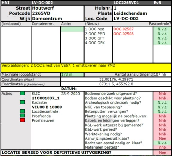 b. Op de hoek van de Houtwerf en de Maalderijstraat zijn twee containers voor restafval geplaatst. Als wij het goed begrijpen, worden die verwijderd omdat het een ‘achteruitrijlocatie’ is. Wij vragen ons af of dat verstandig is gezien de omvang van het aanbod van restafval op die locatie. Ter plekke is ruimte beschikbaar terwijl het achteruitrijden minimaal is. Naar onze mening kunnen er naast deze containers nog eens twee worden geplaatst. Daarnaast zou een locatie moeten worden aangewezen voor de overige twee containers.