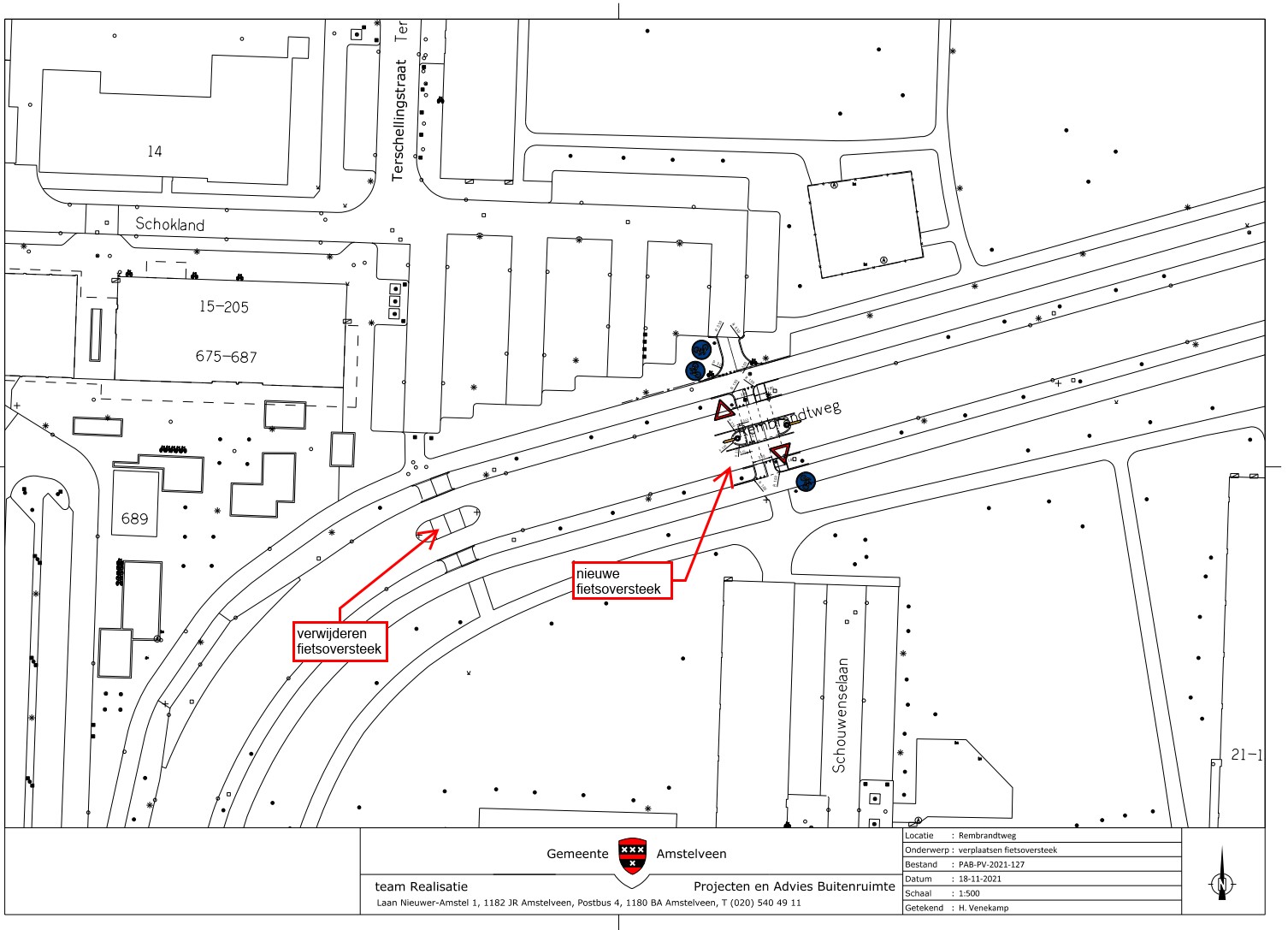 Burgemeester en wethouders van Amstelveen besluiten om de fietsoversteek op de Rembrandtweg die toegang geeft tot de westelijke rijbaan van het parkeerterrein ten zuidoosten van de kruising Schokland-Terschellingstraat op te heffen en deze oversteek ca 90 meter in oostelijke richting te verplaatsen naar een punt ten noorden van de Schouwenselaan, zoals aangegeven op tekening PAB-PV-2021-127.