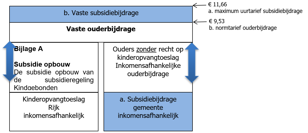 De vaste subsidiebijdrage per uur is een subsidiebijdrage die geldt voor alle kinderen en dient om de ouderbijdrage te dempen. Deze subsidiebijdrage dekt - tot een vastgesteld maximum uurtarief - het verschil tussen het kostendekkend uurtarief van de aanbieder en het normtarief voor de ouderbijdrage dat aanbieders bij ouders in rekening brengen. Het maximum uurtarief voor de subsidiebijdrage (a.) bedraagt in 2022 € 11,66. Het normtarief voor de ouderbijdrage (b.) bedraagt in 2022 € 9,53.