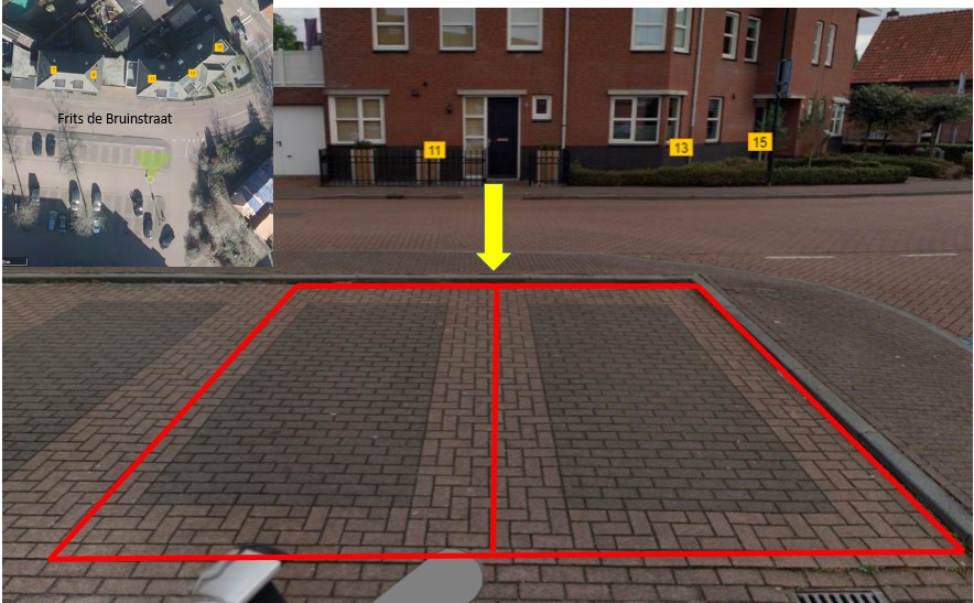 Note: aan te wijzen locatie tegenover Frits de Bruijnstraat 11 (rood = punt 1, geel = locatie laadpaal en punt 2 verkeersbord e4 met onderbord)