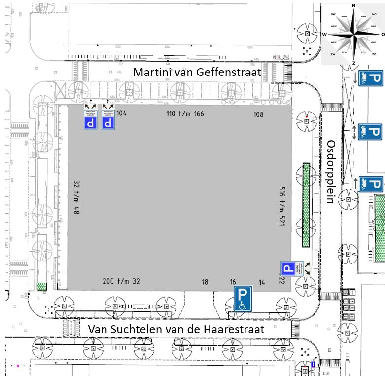 Het instellen van vier plekken voor het opladen van elektrische voertuigen aan de noordkant van perceel Martini van Geffenstraat 51 t/m 104 door het plaatsen van een bord conform model E4 als bedoeld in bijlage 1 van het RVV 1990, gecombineerd met onderbord met de tekst ‘opladen elektrisch voertuig’, en onderbord OB504 met daarop afgebeeld twee pijlen op een hoek van 45° als bedoeld in bijlage 1 van het RVV 1990