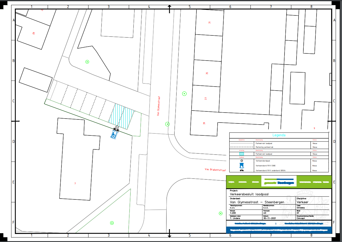 dat er een verzoek is ingediend voor het plaatsen van een oplaadpaal en het aanwijzen van 2 parkeerplaatsen voor het opladen van elektrische voertuigen aan de Van Glymesstraat te Steenbergen, conform bijgesloten tekening;