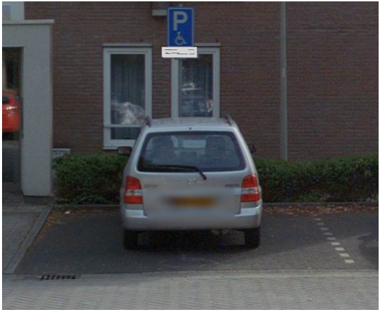Plaatsen van het bord gehandicaptenparkeerplaats (bord E06) met daaronder het kenteken op een onderbord (OB309).