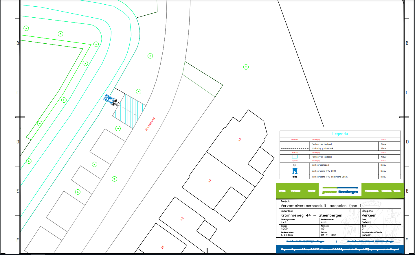 dat er een verzoek is ingediend voor het plaatsen van een oplaadpaal en het aanwijzen van 2 parkeerplaatsen voor het opladen van elektrische voertuigen aan de Krommeweg te Steenbergen, conform bijgesloten tekening;