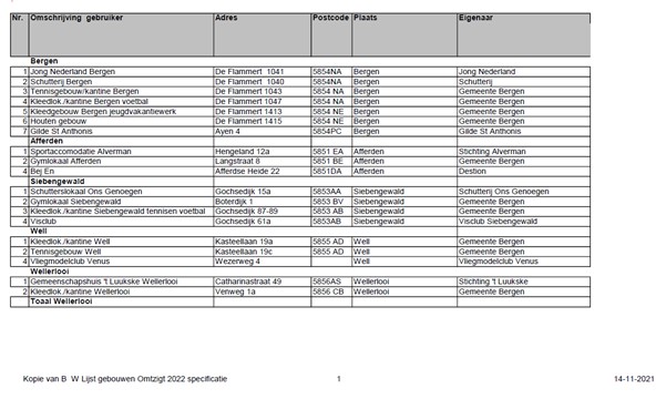 In het kader van het amendement Omtzigt zal het woontarief OZB worden toegepast voor sportaccommodaties, dorpshuizen en andere instellingen van een sociaal belang. De lijst welke panden hiervoor zijn aangewezen in de gemeente Bergen zijn als bijlage toegevoegd.