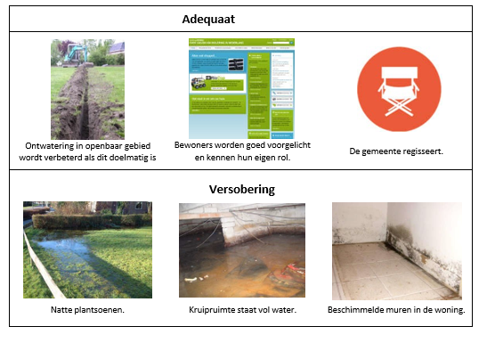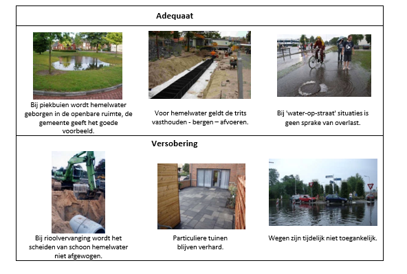 De volgende figuur geeft enkele sfeerbeelden weer bij de invulling van de zorgplicht stedelijk afvalwater. De bovenste rij geeft het beeld weer bij aan adequate invulling, de onderste rij geeft de mogelijke consequenties van een versobering aan.