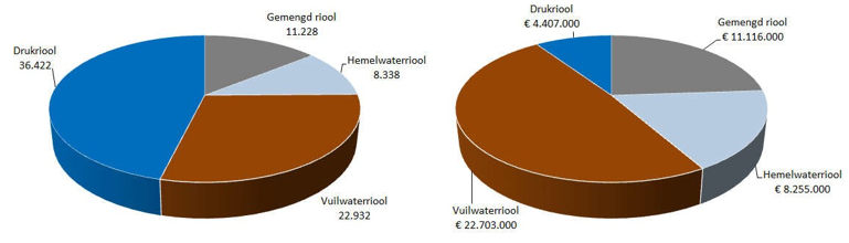 Figuur 4-1: Lengte en vervangingswaarde riolering per stelseltype [in m. en in €]