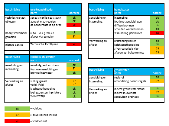 Het beeld dat uit deze toetsing ontstaat is dat een aantal gebieden het inzicht onvoldoende is om een goed oordeel voor de betreffende kwaliteitsnorm te kunnen vormen. De beheerdata is niet volledig op orde. De reden hiervoor is helder en is reeds geconstateerd in de evaluatie. Doordat het beheersysteem ten dele is aangevuld heeft er nog geen opvolging kunnen plaatsvinden richting de actualisatie van de toetsing, het meten van het werkelijk gedrag en de optimalisatiestudie afvalwaterketen.