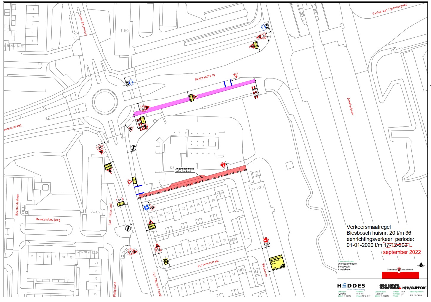Het inrijden van Biesbosch is uitsluitend toegestaan vanaf de Van Heuven Goedhartlaan. Het betreffende gedeelte van Biesbosch is aan de oostkant vanaf een punt 50 meter ten noorden van de kruising met de Puttensestraat gesloten voor bestuurders. Er geldt op het gedeelte van de Rembrandtweg tussen de Beneluxbaan en de kruising met de Van Heuven Goedhartlaan en Laan Rozenburg en op het gedeelte van de Van Heuven Goedhartlaan tussen de kruising met de Puttensestraat en de kruising met de Rembrandtweg en Laan Rozenburg tijdelijk een maximumsnelheid van 30 km/uur. Bouwverkeer dat het bouwterrein oprijdt en verlaat verleent voorrang aan bestuurders op de Rembrandtweg en de Van Heuven Goedhartlaan.