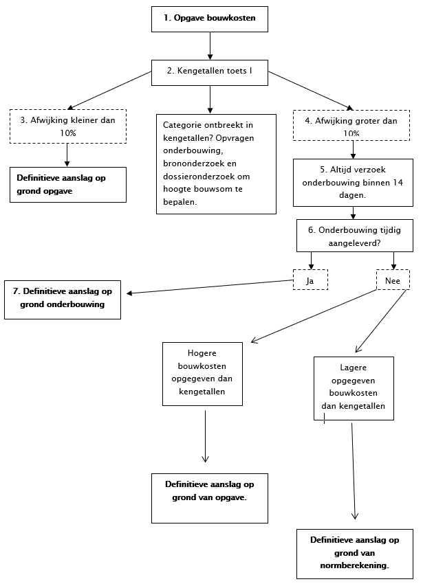 Om de aannemelijkheid van deze opgave van de bouwkosten te kunnen toetsen is een lijst met kengetallen ontwikkeld door het Nederlands Bouwkosten Instituut. Via de kengetallenlijst is het mogelijk om voor ieder bouwplan te bepalen hoe hoog de gemiddelde/normale bouwkosten zijn. In het navolgende wordt deze uitkomst de normberekening genoemd. Omdat de normberekening een weergave is van de gemiddelde/normale bouwkosten, zal de opgave van de bouwkosten hier in de regel iets van afwijken. Binnen bepaalde, hierna aangegeven grenzen is dit acceptabel. Bij een grotere afwijking zal op basis van een meer gedetailleerde toetsing door de vergunningverlener moeten worden bepaald of de opgave van de bouwkosten aannemelijk zijn.