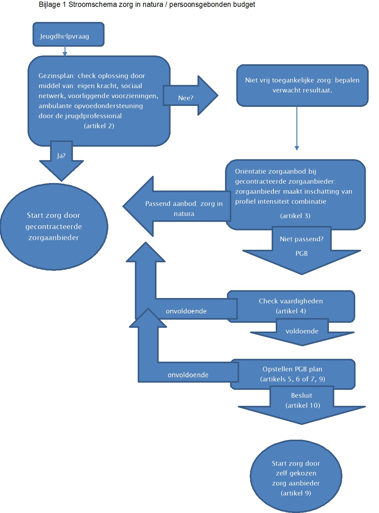 De afweging of wordt gekozen voor een persoonsgebonden budget of zorg in natura volgt nadat is vastgesteld dat er recht is op niet vrij toegankelijke hulp (artikel 2) en na oriëntatie van aanvrager op zorgaanbieders (artikel 3), waaruit blijkt dat niet kan worden voorzien in oplossing van de zorgvraag vanuit: