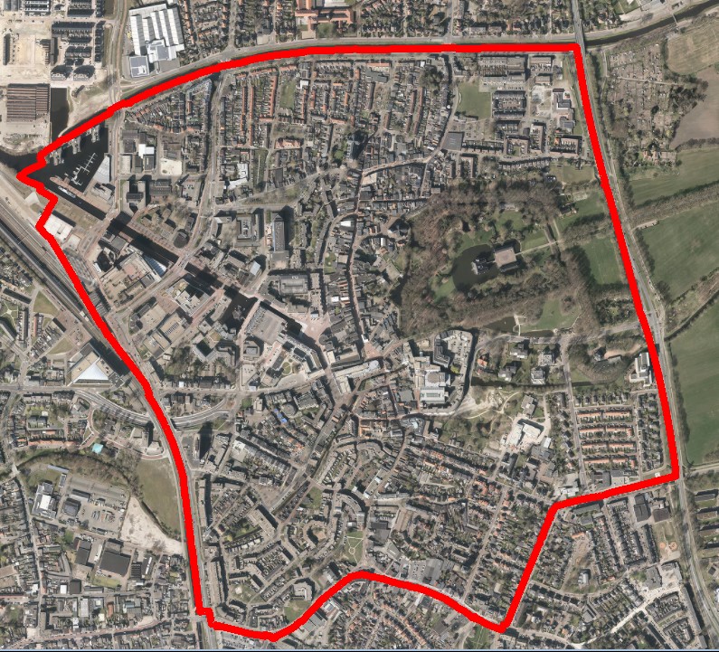 Er zijn verschillende grensdefinities van het centrum dan wel de binnenstad. In de praktijk levert ook dit onnodig verwarring op. De CROW publicatie hanteert het begrip centrum. In het parkeerbeleidsplan kennen we ook het begrip centrum. Hier is het begrip ‘centrum’ gebruikt voor het gebied waar een betaald parkeren-regime heerst. Feitelijk is voor de toepassing van de parkeernormen het parkeerregime echter niet bepalend, maar meer het karakter, de uitstraling van het gebied en de heersende parkeerdruk. De toepassing van minimumparkeernormen past bij een beleid van een autoluwe binnenstad en omvat daarmee ook de schilgebieden, de gebieden met een bestaande parkeerdruk. Na de totstandkoming van het parkeerbeleidsplan (2012) hebben we te maken gekregen met de ontwikkelingen rond de Omgevingswet/Omgevingsvisie. Het is logisch te kijken hoe we hierbij kunnen aansluiten. We gebruiken voor de afperking van het begrip ‘centrum’ de begrenzing van de binnenstad zoals deze is opgenomen in de Omgevingsvisie en welke ook op die wijze gebruikt gaat worden bij de gebiedsindeling van het Omgevingsplan. Zie de kaart hieronder, de rode lijn begrenst het gebied binnenstad/centrum. Op voorhand onderscheiden we geen verschillende deelgebieden. In individuele gevallen kunnen we gemotiveerd een specifieke parkeernorm voorschrijven. Locatie specifieke eisen of specifiek beleid, zoals voor transformatiegebieden, liggen hier dan aan ten grondslag.