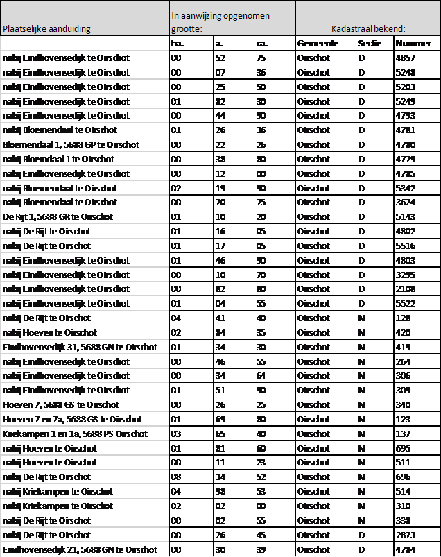 Burgemeester en wethouders van de gemeente Oirschot maken op grond van artikel 7, lid 1 van de Wet voorkeursrecht gemeenten ('Wvg') bekend dat zij op 30 maart 2021 hebben besloten om op grond van artikel 6 Wvg percelen aan te wijzen waarop de artikelen 10 tot en met 15, 24 en 26 Wvg van toepassing zijn. Het betreffen de onderstaande percelen gelegen in het gebied nabij de Eindhovensedijk te Oirschot.