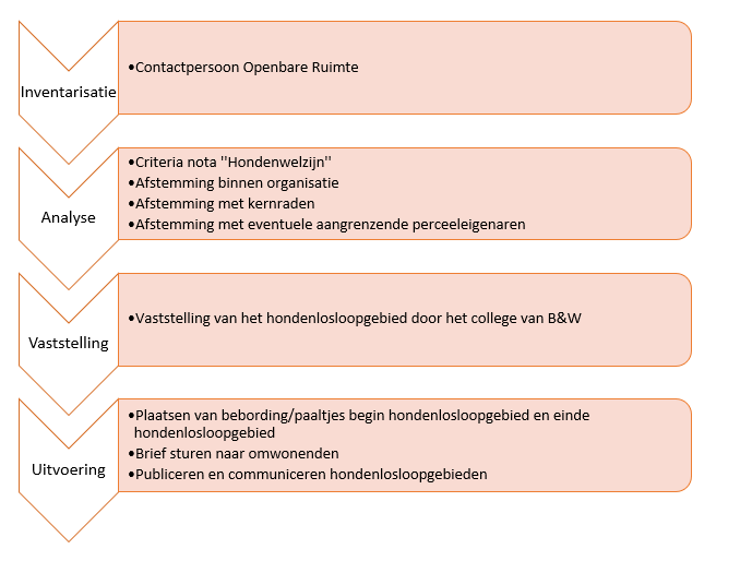 In dit hoofdstuk wordt middels een schema toegelicht hoe het aanmerken van een hondenlosloopgebied tot stand komt.