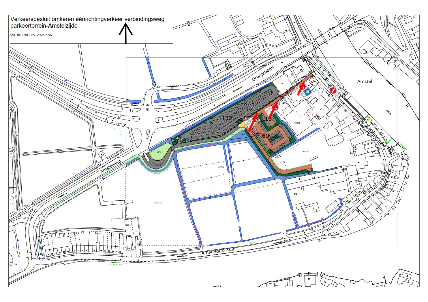 Het afbreken van de hellingbaan maakt het noodzakelijk het eenrichtingsverkeer dat geldt voor het gedeelte van Amstelzijde tussen het pand Amstelzijde 85 en het gedeelte van deze weg dat langs de Amstel ligt om te draaien. Hierdoor is het gedeelte van Amstelzijde langs de Amstel in het vervolg vanaf Amstelslag via het genoemde parkeerterrein bereikbaar. De rijrichting sluit aan op de toegestane rijrichting op het gedeelte van Amstelzijde langs de Amstel dat eveneens is aangewezen als eenrichtingsweg. Ook na het omdraaien van het eenrichtingsverkeer zijn fietsers en bromfietsers van het eenrichtingsverkeer uitgezonderd.