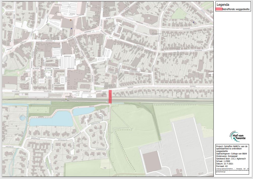 Het Rijk heeft het streven om het aantal Niet Actief Beveiligde Overwegen (NABO’s) uiterlijk in 2023 terug te brengen tot nul, omdat deze onbeveiligde overwegen gevaarlijke situaties met zich meebrengen. Het Rijk heeft ProRail gevraagd deze taakstelling te realiseren. Binnen de gemeente Hof van Twente liggen 13 NABO’s. Daarvan zijn 5 NABO’s niet openbaar toegankelijk, de overige 8 NABO’s zijn openbaar (toegankelijk). ProRail heeft samen met de gemeente gewerkt aan een maatregelenpakket voor deze 8 NABO’s. Voor de uitvoering van dit maatregelenpakket is voor vier weggedeelten, waaronder Zompepad in Goor, het spoorkruisende deel (spoorlijn Zutphen-Hengelo) en het gedeelte tussen spoorlijn Zutphen-Hengelo en de Irisstraat )hierna: NABO Zompepad), onttrekking aan de openbaarheid noodzakelijk.