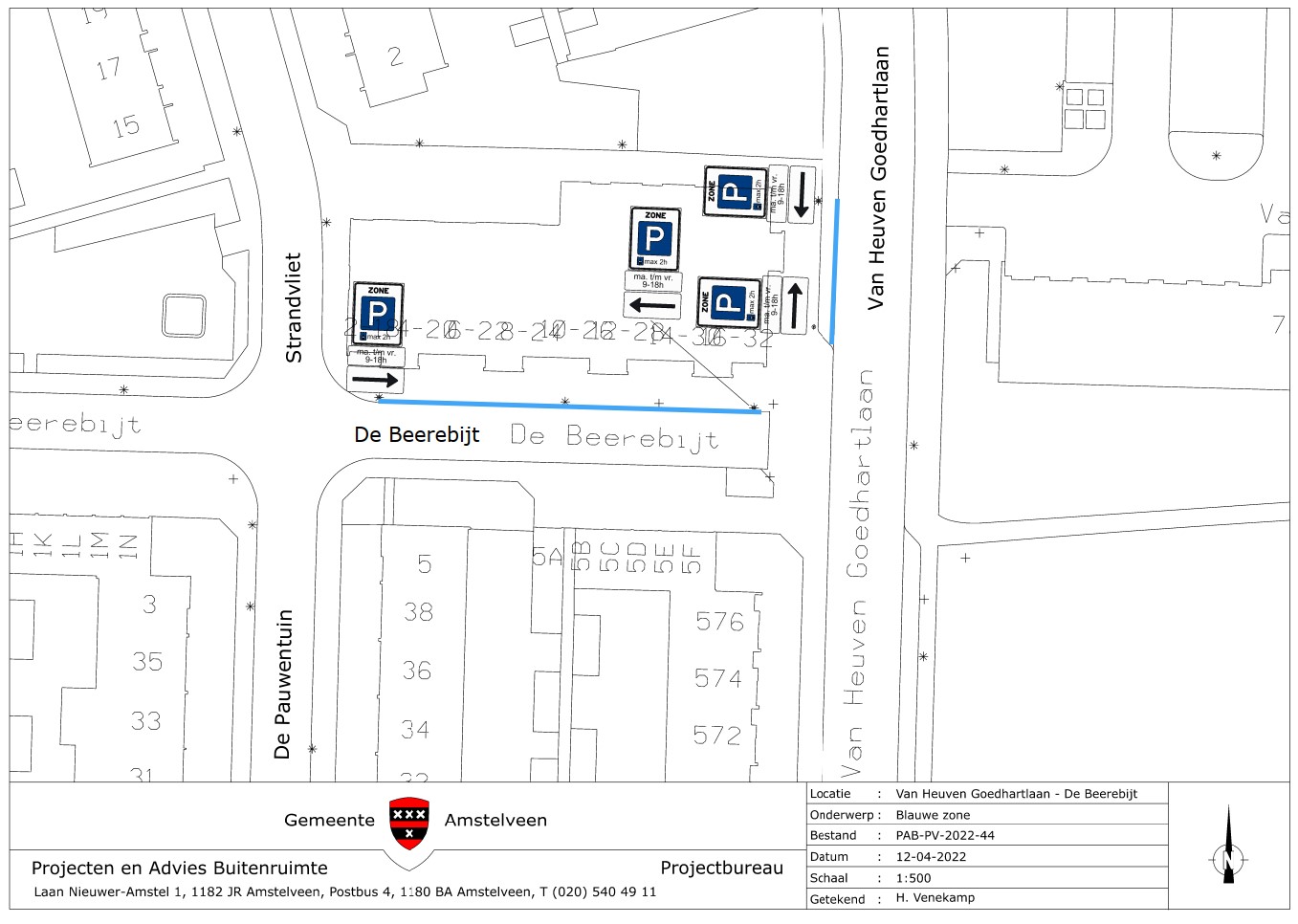 Burgemeester en wethouders van Amstelveen besluiten om de parkeerhavens aan de noordkant van het gedeelte van De Beerebijt tussen Strandvliet en de Van Heuven Goedhartlaan en aan de westkant van de Van Heuven Goedhartlaan, direct ten noorden van de kruising met De Beerebijt aan te wijzen als parkeerschijfzone, zoals aangegeven op tekening PAB-PV-2022-44.