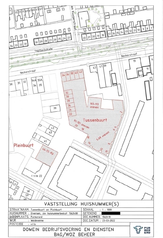 Kennisgeving huisnummerbesluit Pleinbuurt 46 t/m 55 doorlopend te Purmerend, Tussenbuurt 1 t/m 115 oneven te Purmerend, Tussenbuurt 1 t/m 42 even te Purmerend