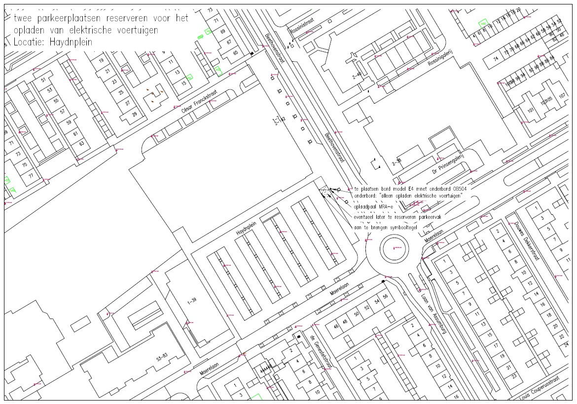 1. Door het plaatsen van een bord volgens model E4 van bijlage 1 van het RVV 1990, het aanbrengen van een onderbord volgens model OB504, aanduiding dat het bord alleen geldt voor de twee aangegeven parkeerplaatsen, en een onderbord met de tekst “alleen voor opladen elektrische voertuigen”, twee parkeervakken aan Haydnplein, voor Haydnplein huisnummer 10, te reserveren voor het opladen van elektrische voertuigen;