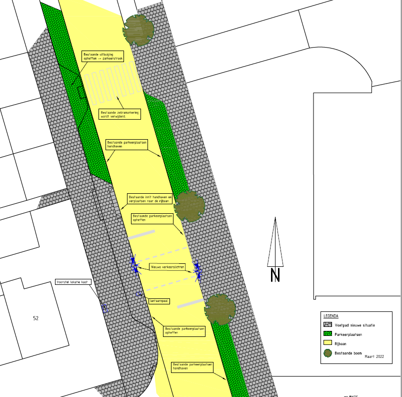 - de voetgangersoversteekplaats (zebrapad) daarom wordt vervangen door verkeerslichten die ongeveer 25 meter zuidelijker wordt geplaatst zodat overstekende voetgangers geregeld oversteken en daarbij beter zichtbaar voor het verkeer zijn doordat zij niet meer tussen de geparkeerde auto’s oversteken