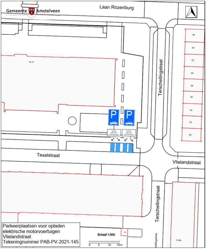 Burgemeester en wethouders van Amstelveen besluiten om in de Texelstraat vier parkeerplaatsen aan te wijzen als parkeerplaats voor het opladen van elektrische motorvoertuigen. De parkeerplaatsen mogen alleen gebruikt worden voor het opladen van deze elektrische motorvoertuigen.