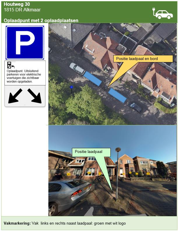 Twee parkeerplaatsen op de Houtweg, ter hoogte van nummer 30, aan te wijzen als oplaadpunt voor een elektrisch voertuig. De maatregel zal ter plaatse worden aangeduid door het bord conform model E4 van bijlage 1 van het Reglement Verkeersregels en Verkeerstekens (RVV 1990), op een onderbord zal worden aangegeven voor welke doelgroep en onder welke voorwaarden het gebruik van de parkeergelegenheid geldt. De borden worden geplaatst zoals aangegeven op de bij dit besluit behorende tekening.