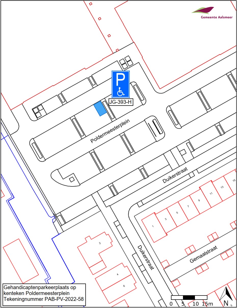 Burgemeester en wethouders van Aalsmeer besluiten het parkeren te verbieden op een parkeerplaats op het Poldermeesterplein, zoals aangegeven op tekening PAB-PV-2022-58, met uitzondering van het voertuig met het kenteken JG-393-H (gehandicaptenparkeerplaats).