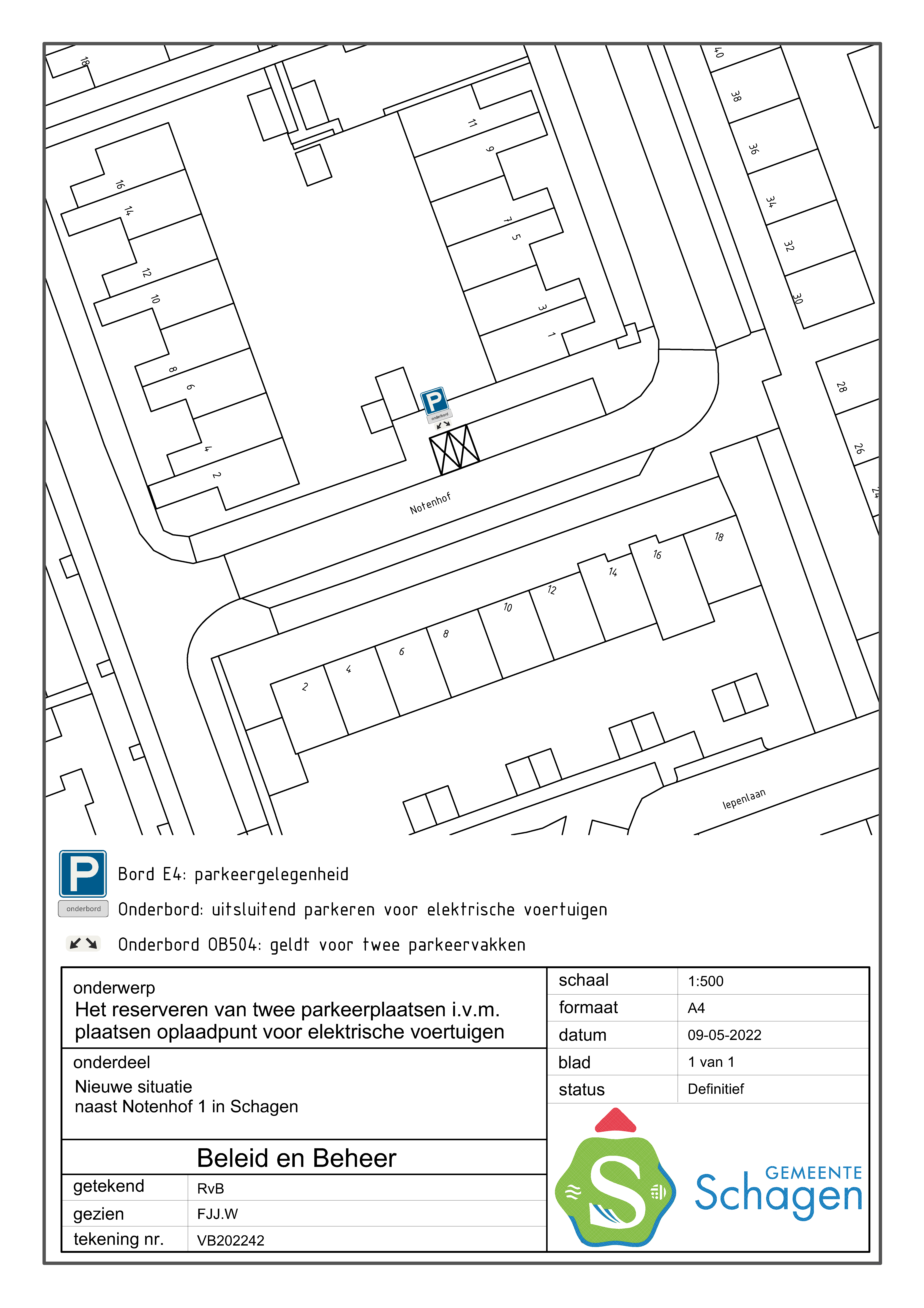 De gemeente Schagen heeft onlangs een verzoek ontvangen van een bezitter van een elektrisch voertuig voor het plaatsen van een laadpaal nabij de woning op het Notenhof 1, Schagen. Daarnaast is er ook de wens om een openbaar laadpunt te realiseren voor (bezoekers van) omwonenden. Het is dan wel nodig om aan weerszijden van het oplaadpunt een parkeerplaats te reserveren voor het opladen van elektrische voertuigen.